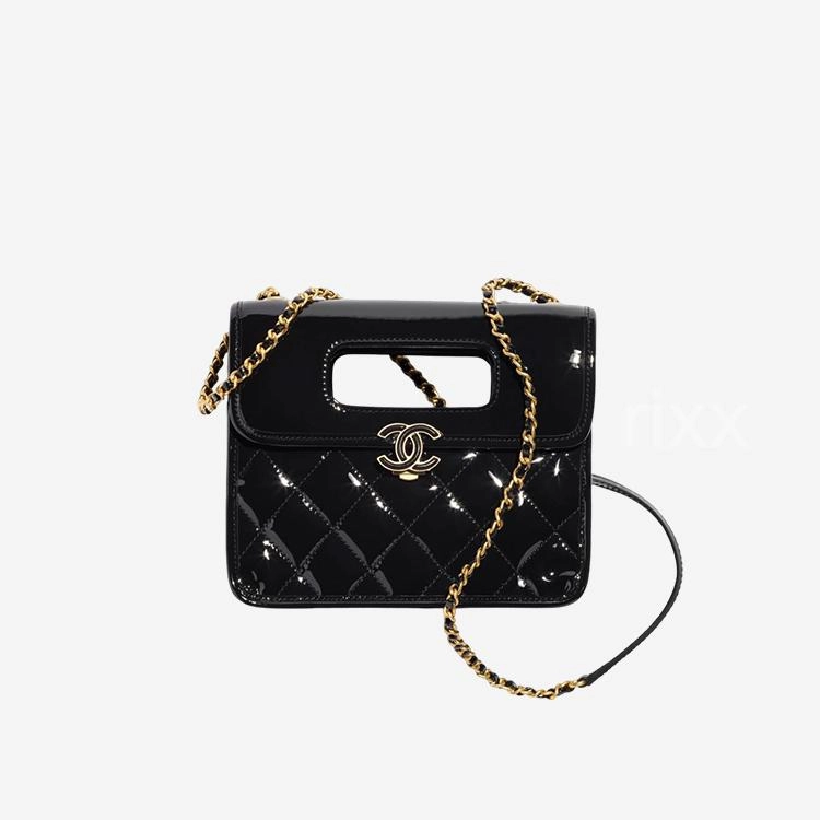 (W) 샤넬 핸들 장식의 미니 플랩백 페이턴트 카프스킨 & 골드 메탈 블랙 【매장-730만원대】